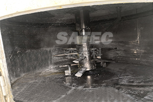 森泰科强力混合机的混合盘安装于一个球轴承回转支撑上,按顺时针方向低速转动;偏心设置的高速混合转子安装有不同位置及高度的搅拌叶片,按逆时针方向旋转。不动的外壁和底部刮板使所有物料都100%参与混合过程。